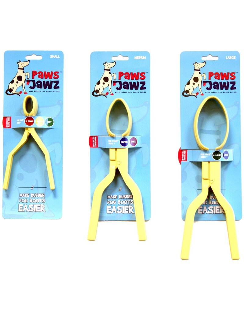 Speed up dress-up! Now you only need one hand to dress your dog in Pawz boots. Just sit. No wriggling for you or your dog! The Jawz have a lip, so just squeeze on the boot, and squeeze the Jawz open, and your dog's paws are ready for the outside world. Available in three sizes to accommodate Pawz boots sizing.