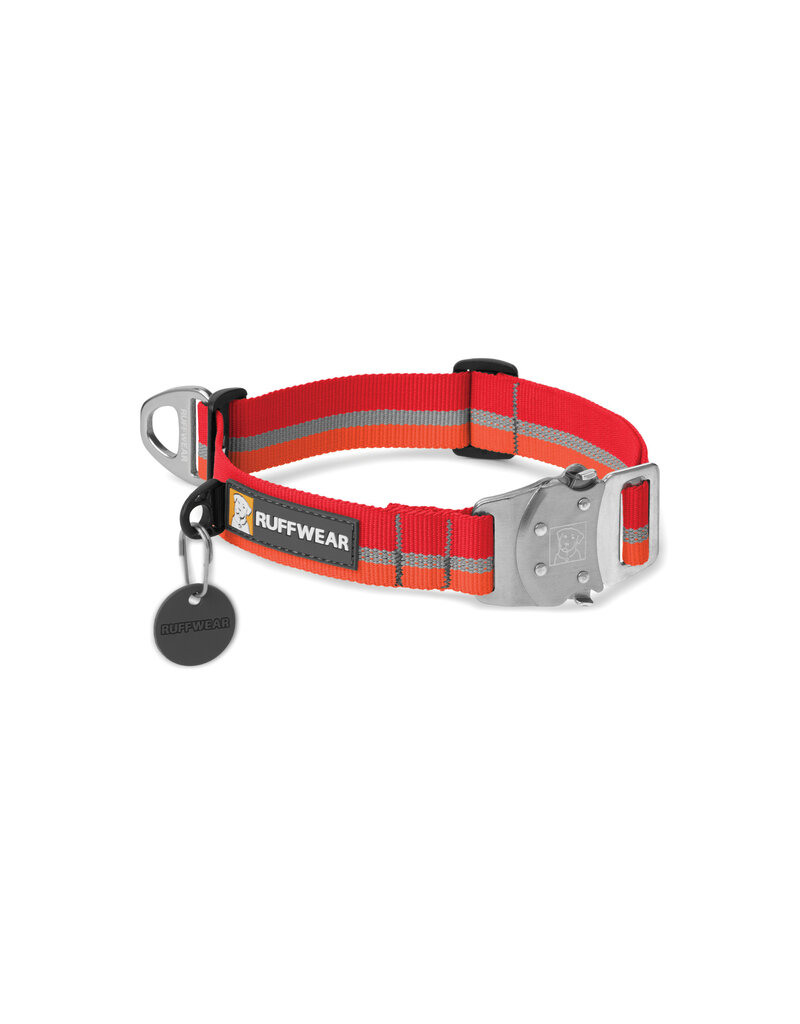 The Ruffwear Top Rope™ collar is rugged and reliable with an all metal side-release buckle! The V ring attachment has the ability to be move along the collar, allowing for quick leashing. Other features include a separate ID tag attachment loop with tag silencer as well as integrated reflective trim offering safety at night.